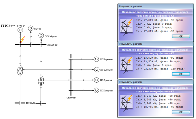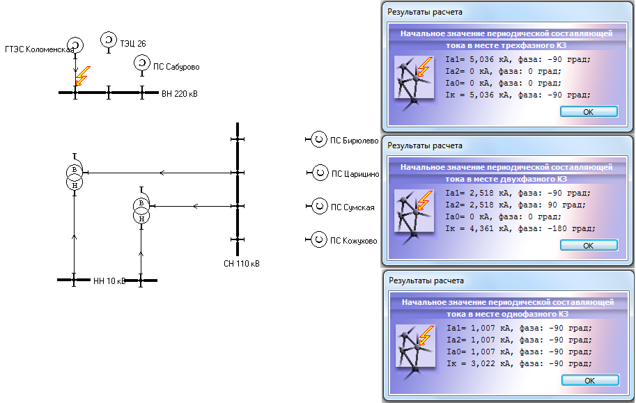 Токи короткого замыкания на шинах 110 кВ составляют I(3)=4580А и I(1)=4690А, на шинах 10 кВ составляют I(3)=16458А, на шинах 10 кВ составляют I(3)=23043А.