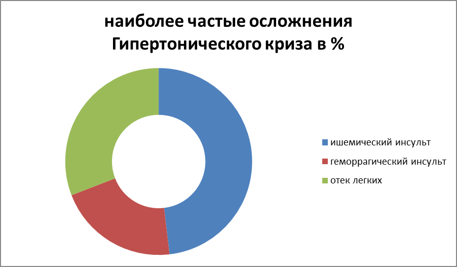 - Наиболее частыми осложнениями гипертонического криза являются цереброваскулярные нарушения (39% ишемический инсульт, 17% геморрагический инсульт) и отек легких (25%).