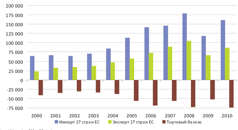 В течение последнего десятилетия торговый баланс ЕС-27 с Россией был отрицательным и в 2008 г. он достиг 73 миллиардов евро. В 2009 г. (кризисном году) этот дефицит сократился до 52 миллиардов евро, в связи с низкими ценами на энергию в мире; но в 2010 г. дефицит вернулся к уровню (74 миллиарда евро), сопоставимому с уровнем 2008 г. (рис.1).