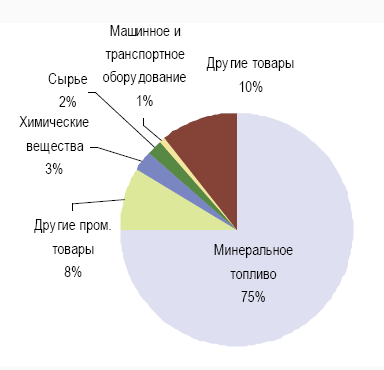 Из диаграммы (рис.2) мы видим, что в 2010 г. 75 % общего объема импорта 27 стран-членов ЕС из России (120 миллиардов евро) составили «Минеральные виды топлива». При этом львиную долю (85 %) среди «Минеральных видов топлива» составляют нефть и нефтепродукты, а газ 11 %. Все остальные категории товаров составляют до 10 % каждая; самая крупная из них доля приходится на «Другие промышленные товары» (8%).