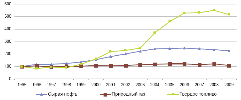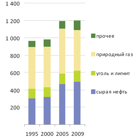 На рисунке 4 показано развитие производства первичной энергии в России. В целом, до 2008 г. производство постепенно увеличивалось (+32 % в период с 1995 г. по 2008 г.). В условиях финансового и экономического кризиса (20082009 гг.) первичное производство сократилось. Сокращение коснулось нескольких видов товаров, за исключением сырой нефти, объемы которой за этот период слегка выросли (+1,4 %, с 487 миллионов тнэ до 493 миллионов тнэ). Производство сырой нефти с начала XXI века быстро растет. Основными причинами такого роста является применение современных технологий добычи и растущие мировые цены на энергию на фоне того, что из-за девальвации российского рубля выросло конкурентное преимущество нефти.