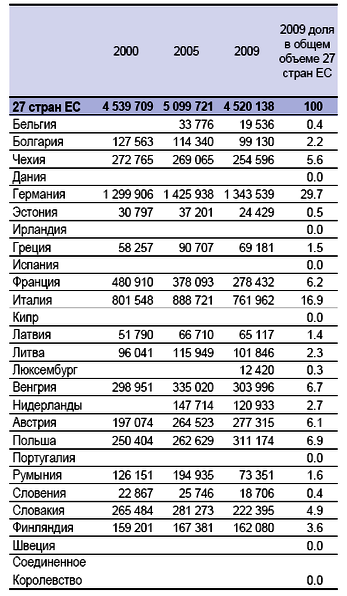 По статистическим данным по торговле в России [13] и Европейском союзе (ЕС) [14] экспорт ЕС-27 в Россию с начала столетия, в целом, увеличивался, за исключением кризисного 2009 г., в котором был отмечен спад на 38 % по сравнению с 2008 г. Но затем в 2010 г. объемы экспорта ЕС-27 значительно возросли (+31 % в 20092010 гг.).