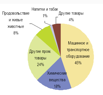 Следует отметить, что экспорт 27 стран-членов ЕС в Россию (рис.3) является более разнообразным, хотя и в нем доминирующим является «Машинное и транспортное оборудование», составляющее 45 % («Дорожные транспортные средства» составляют четверть этой категории). Следующие важные категории «Химические вещества» и «Другие промышленные товары» составляют соответственно 18 % и 24 %. «Продовольствие и живые животные» составляют также довольно большую долю (8 %).