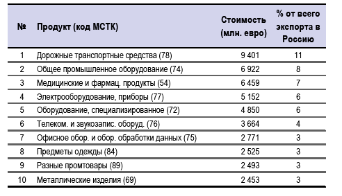Если проанализировать 10 главных продуктов, экспортируемых ЕС-27 в Россию, то мы видим, что здесь заметно большее разнообразие категорий, хотя здесь также отмечается доминирование машинного и технического оборудования. «Дорожные транспортные средства» составляют наибольшую долю (11 %), но имеют относительно небольшой отрыв от «Общего промышленного оборудования» (8%) и «Электрического оборудования» (6%) и «Специализированного оборудования»(6%).