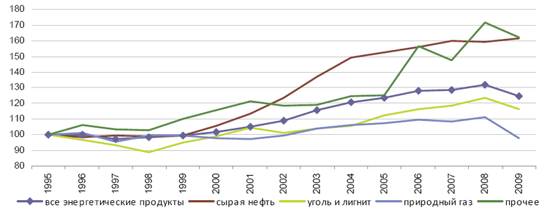 Рис. 4. Первичное производство энергии в России индексированная последовательность (1995г.=100)*
