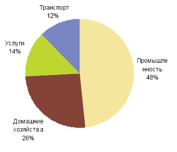 Россией все активнее признается необходимость продвижения к более эффективному потреблению энергии, включая развитие и применение экологически чистых технологий. Помышленность в 2009 г. потребляла 48 % общего конечного объема потребляемой энергии, примерно столько же, сколько и в предыдущие годы (рис.6).
