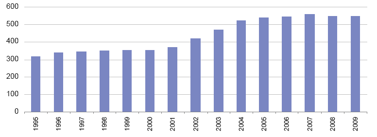 В течение уже многих лет Россия - надежный поставщик энергии в ЕС. Таким же образом ЕС является основным, но не единственным рынком для российского энергетического экспорта. Россия, учитывая все энергетические продукты, постепенно наращивает чистый энергетический экспорт (экспорт минус импорт). Если во второй половине 1990х годов чистые объемы экспорта возросли лишь немного, то в начале этого столетия было произошло существенное увеличение (рис.8). В 2007 г. был достигнут пик, когда чистый экспорт составил 559 миллионов тнэ. В 20072008 гг. Произошло падение мировых объемов чистого экспорта на 2,2 % до 547 миллионов тнэ, примерно до уровня 2009 г. (549 миллионов тнэ).