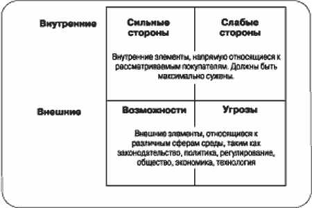 Простейшая форма представления результатов SWOT-анализа приведена на рисунке 3 перечисляются сильные и слабые стороны, возможности и угрозы. Благодаря своей концептуальной простоте SWOT стал легко применимым для менеджеров и столь же подверженным неправильному применению. Для его проведения не требуются ни обширные базы данных, ни формальная подготовка. Любой, кто хоть немного знаком с компанией и имеет представление о рынке, может составить простой SWOT. С другой стороны, присущая анализу простота может привести к поспешным и бессмысленным выводам, полным таких неопределенных и двусмысленных понятий, как « эксплуатационная характеристика продукта», «современное оборудование», «цены». Вдобавок, пользователи иногда забывают об объективности и полагаются на устаревшую или ненадежную информацию.