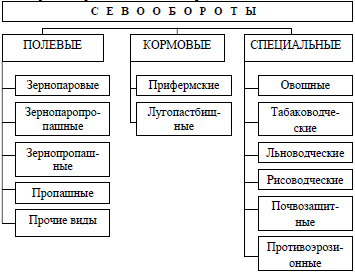 Полевые севообороты подразделяются на зернопаровые, зернопаропропашные, зернопропашные, пропашные и другие виды; кормовые - на прифермерские и лугопастбищные, расположенные вблизи летних лагерей; специальные севообороты организуются для возделывания культур, требующих специфичной агротехники (овощные, табаководческие, льноводческие, рисоводческие и т. п.). Вводятся также почвозащитные и противоэрозионные севообороты.