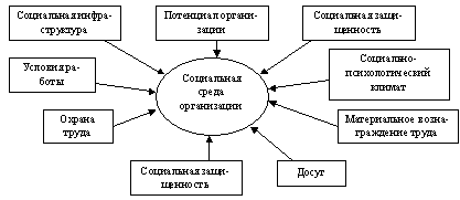 На наш взгляд, к основным составляющим социальной среды организации относятся: потенциал организации, социальная инфраструктура, условия работы и охрана труда, социальная защищенность работников, социально-психологический климат в коллективе, стимулирование трудового поведения, внерабочее время и использование досуга.