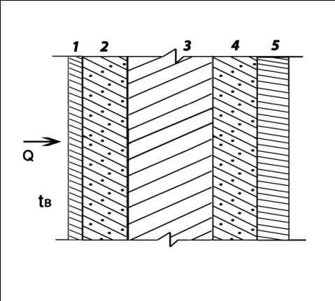 k - количество слоев от внутренней поверхности ограждающей конструкции до плоскости возможной конденсации, равен 2.
