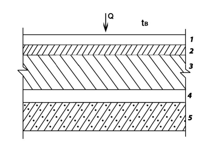 1,5 - отделочные слои: цементно-песчаный раствор = 1800кг/м3, 1 = 0,025 м, 5 = 0,025 м;