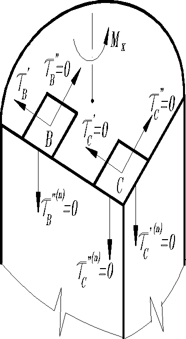 Отметим, что в стержне произвольного сечения касательные напряжения вблизи точек контура направлены по касательной к нему. Действительно, предположим, полное напряжение вблизи точки В представлено двумя составляющими: