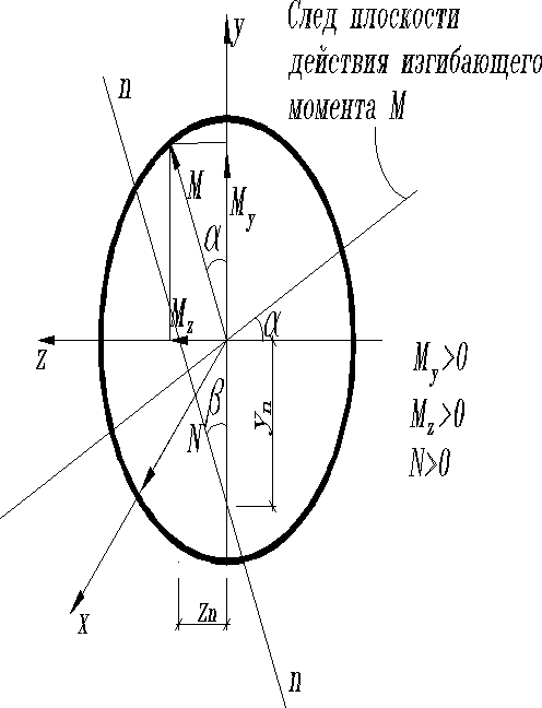 Из выражений а) и б) видно, что нейтральная линия в сечении в общем случае не перпендикулярна к следу плоскости действия в том же сечении результирующего изгибающего момента. Эти линии будут перпендикулярны лишь при условии равенства углов и , а это в свою очередь возможно только в следующих случаях: 1) , т.е. ; 2) , т.е. ; 3) .