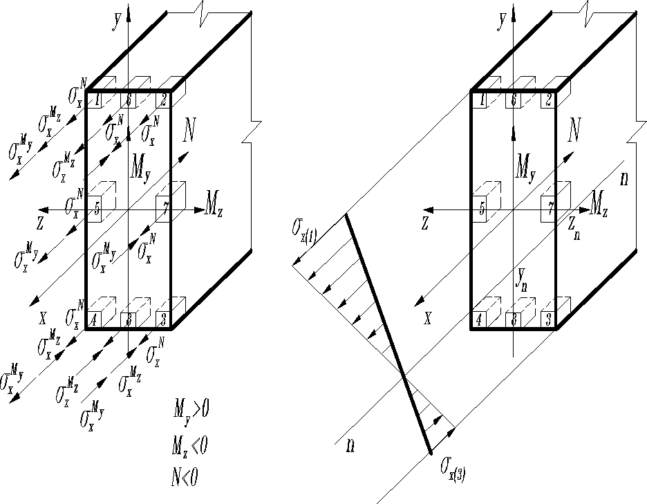 Нормальные напряжения, обусловленные действием изгибающих моментов , находим по формулам
