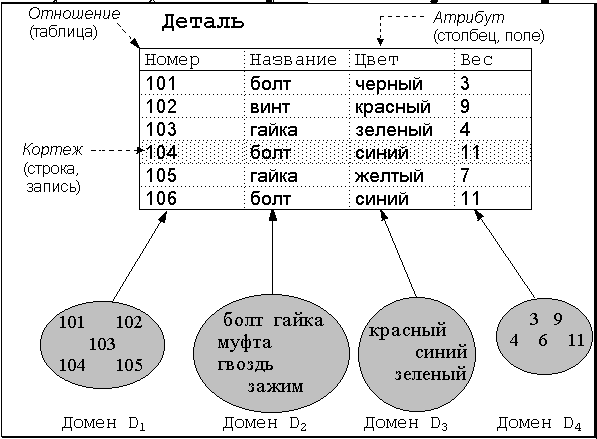 Легко заметить, что отношение является отражением некоторой сущности реального мира (в данном случае - сущности “деталь”) и с точки зрения обработки данных представляет собой таблицу. Поскольку в локальных базах данных каждая таблица размещается в отдельном файле, то с точки зрения размещения данных для локальных баз данных отношение можно отождествлять с файлом. Кортеж представляет собой строку в таблице, или, что то же самое, запись. Атрибут же является столбцом таблицы, или - полем в записи. Домен же представляется неким обобщенным типом, который может быть источником для типов полей в записи. Таким образом, следующие тройки терминов являются эквивалентными: