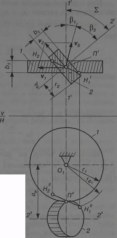 На рис. 4 показано проекції двох початкових циліндрів гвинтових зубчастих коліс 1 і 2, бічні поверхні профілів зубів яких дотикаються одна до одної в точці П. При цьому один циліндр перекочуватиметься по другому, ковзаючи вздовж миттєвої осі обертання і ковзання. Осі 11 і 22 початкових циліндрів схрещуються під кутом . Гвинтові колеса так само, як і косозубі циліндричні колеса, мають гвинтові зуби, нахилені до відповідних осей під кутами 1 і 2. У гвинтових колесах має справджуватись рівність