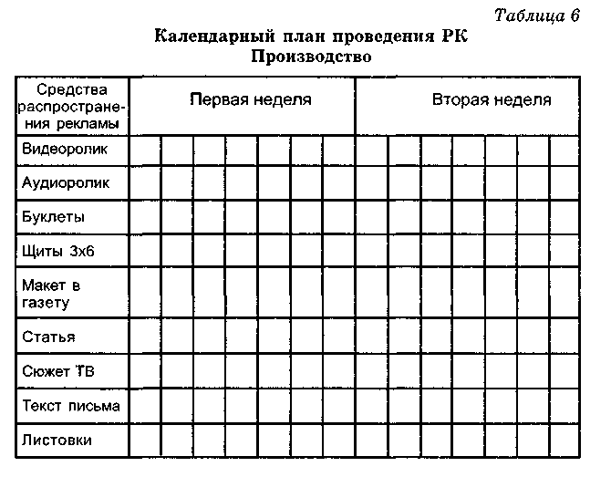 - Средства распространения рекламы. Выбор средств распространения рекламы напрямую связан с концепцией товара и решением по целевой аудитории. В разделе обосновывается выбор СМИ, дается распределение рекламного бюджета по средствам массовой информации медиасплит, а также медиаобсчет, медиаплан, график размещения рекламы в СМИ*. Далее нужно описать те каналы и средства распространения рекламной информации, которые не являются СМИ, например, прямая почтовая рассылка, выставки, ярмарки, наружная реклама и т.д. Заключает этот раздел календарный план (график) проведения РК [12, с. 8] (см. табл. 6, 7).