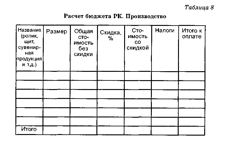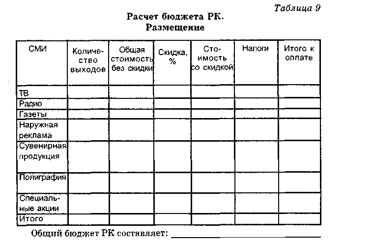 После этого дается расчет бюджета всей РК. Этот документ оформляется, как правило, в виде таблиц. Приведем пример одного из возможных вариантов (табл. 8, 9).