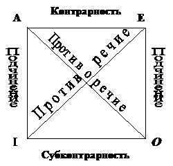 Логический квадрат (квадрат противоположностей) это диаграмма, служащая для мнемонического запоминания логических отношений между видами суждений по объединенной классификации.