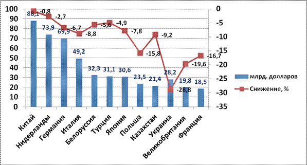 Как видно на рисунке 1, основным торговым партнером России в 2014 году являлся Китай. Хотя товарооборот с ним и снизился на 0,8 %, однако, по предварительной оценке, составил более 88 миллиардов долларов. [12]