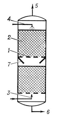 Смесь газов поступает в нижнюю часть колонны по трубопроводу, а абсорбент, подаваемый по трубе 4, стекает вниз по насадке навстречу поднимающейся смеси газов. В результате противоточного контактирования газа и жидкости происходит наиболее полное растворение поглощаемых компонентов газовой смеси в абсорбенте. Не поглощённые компоненты газовой смеси удаляются и по трубопроводу 5, а насыщенный абсорбент вытекает снизу по трубопроводу 6. Конусы 7 между секциями насадки 2 направляют абсорбент, вытесняемый газом к стенке, к центру для более равномерного орошения.