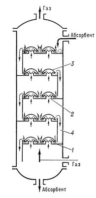 Более сложен абсорбер, представляющий собой колонну (рис. 2), в которой вместо решёток и насадки установлены тарелки 1, снабженные патрубками 2, колпачками 3 с зубчатыми краями и переливными трубками 4. Абсорбент стекает с тарелки на тарелку по переливным трубкам, а смесь газов движется снизу вверх, барботируя через слой жидкости. При прохождении между зубьями колпачков газовый поток разбивается на множество мелких пузырьков, что обеспечивает большую поверхность соприкосновения газа и жидкости. В ряде случаев вместо тарелок с колпачками устанавливаются тарелки, в которых просверлено большое число отверстий ситчатые тарелки.