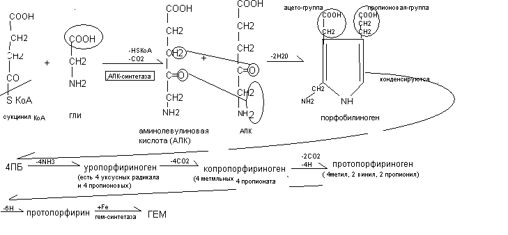 Синтез гемоглобина происходит в ретикулоцитах, эритробластах, в печени, костном мозге, селезенке, тимусе. Исходными веществами для синтеза гема являются активная форма янтарной кислоты (сукцинил КоА - из цикла Кребса) и аминокислота глицин. Промежуточные соединения процесса синтеза гема представлены аминолевулиновой кислотой (АЛК), порфобилиногеном, уропорфириногеном, копропорфириногеном, протопорфирином. При соединении 2 х молекул АЛК образуется порфириновое кольцо порфобилиногена. Затем происходят изменения боковых радикалов до появления 4-х метильных, 2-х винильных и 2-х остатков пропионовой кислоты.
