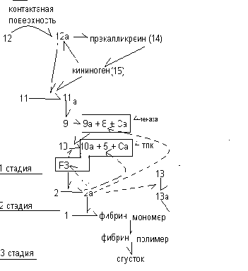 ХII фактор, контактируя с поврежденным эндотелием, переходит в ХII активный. ХIIа активирует прекалликреин (ХIY), который активирует кининоген (ХY). Кинины, в свою очередь, повышают активность ХII фактора.