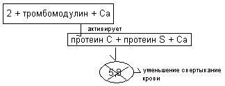Тромбиновый компонент антисвёртывающей системы активный тромбин запускает противосвёртывающий каскадный механизм. Тромбин взаимодействует с особым белком эндотелия сосудов тромбомодулином с образованием комплекса: тромбомодулин, Са2+ , IIа. Этот комплекс активирует протеазу, обозначаемую как протеин «С». Протеин «С» взаимодействует с кофактором - протеином «S» и ионами кальция. Комплекс, включающий протеин «С», протеин «S», Са2+ разрушает Y и YIII факторы свёртывания крови.
