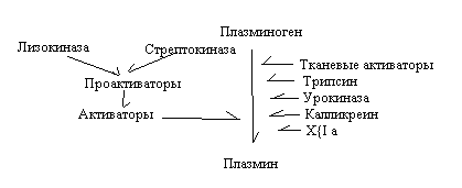 Фибринолитическая система подвергает расщеплению (фибринолизу) образовавшийся кровяной сгусток. Основным компонентом фибринолитической системы является фермент плазмин (фибринолизин). Он представляет собой очень активный протеолитический фермент, способный растворять фибриновый сгусток. Плазмин синтезируется из неактивного предшественника плазминогена. В переходе плазминогена в плазмин участвуют активаторы двух видов: