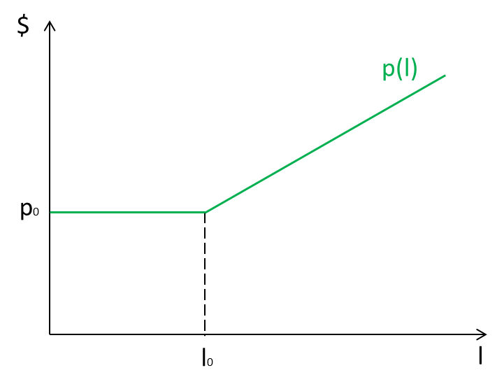 Ключевая особенность рынка такси связана со временем ожидания для пассажиров и холостым пробегом автомобилей такси. Пассажир оплачивает только время поездки, в то время как такси несет издержки и во время ожидания заказа (время водителей, эксплуатация машины и т.п.), и на то, чтобы доехать до точки заказа (добавляются расходы на бензин). Стоимость поездки должна покрывать все издержки. Исторически сложилась система тарификации в зависимости от длины поездки. В автомобилях такси обычно установлены таксометры, которые считают длину поездки (по расстоянию либо по времени) и в зависимости от этого сообщают итоговую стоимость. Тариф на такси обычно устроен так: , где фиксированная часть тарифа (плата за подачу машины), длина поездки (в минутах или километрах), а цена за единицу (минуту или километр). В фиксированную часть тарифа может быть включена предоплата некоторой минимальной длины поездки. После того, как включенный лимит исчерпан, плата взимается по таксе за каждый дополнительный километр или минуту поездки. Графически это можно изобразить следующим образом.