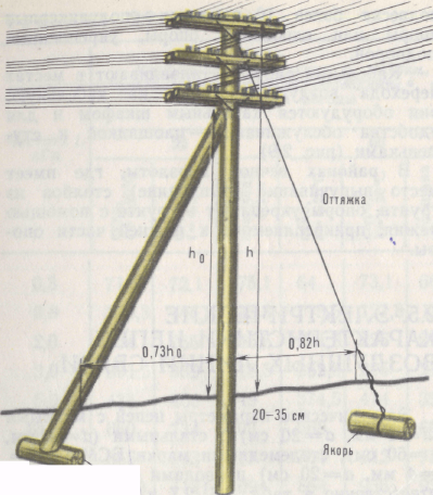 Угловые опорыустанавливают в местах изменения направления (поворота) линии. Такие опоры подвергаются действию равнодействующей силы тяжения проводов, направленной внутрь угла по его биссектрисе. Угловую опору укрепляют подпорой или оттяжкой свиваемой из 68 линейных проводов (рис. 2.6). Оттяжка укрепляется в земле с помощью якоря. При большом числе проводов и значительном угле поворота линии угловую опору укрепляют подпорой и оттяжкой. Для ограничения возможных разрушений на линии в случае больших нагрузок применяют усиленные (рис. 2.7) и противоветровые опоры, устанавливаемые на прямолинейных участках трассы. При числе проводов более шести и место усиленных опор полуанкерные опоры или анкерные опоры (рис. 2.8). Эти опоры устанавливают на линиях типа О через 3 км, Н через и типа У и ОУ через 1 км. Противоветровые опоры устанавливают на середине участка между усиленными или полуанкерными опорами.