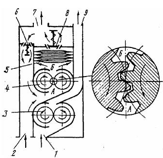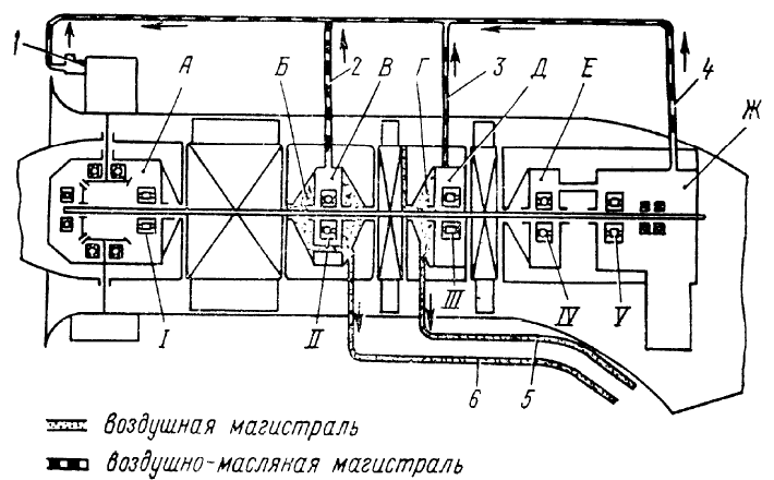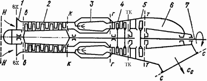 1- входное устройство; 2- компрессор; 3- камера сгорания; 4- турбина компрессора; 5- турбина винта (свободная турбина); 6- выходное устройство;