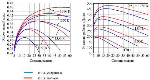 Как указывалось, повышение Т*CA позволяет применять более высокие степени сжатия, оптимальные значения которых увеличиваются с ростом Т*CA. В связи с этим, одновременное повышение температуры перед турбиной и степени сжатия является наиболее эффективным способом повышения КПД и удельной работы цикла.