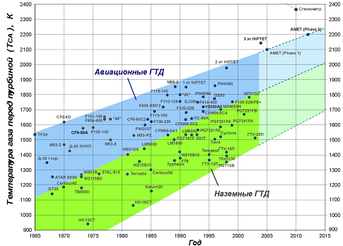 Активное использование новейших авиационных технологий в проектировании и производстве наземных ГТД, а также реализация сложных систем охлаждения турбины с использованием теплообменников и водяного пара в качестве oxладителя позволило наземным ГТД постепенно преодолеть технологическое отставание от авиадвигателей. Новейшие модели мощных энергетических ГТД достигли рабочей температуры газа перед турбиной Т*CA =1700...1800 К. При этом ресурс наиболее нагруженных деталей турбины составляет не менее 25000 часов.