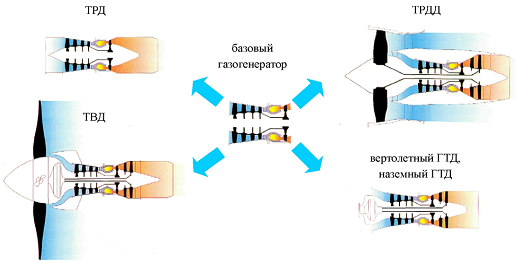 Рис. 2.5. Схема создания различных ГТД на базе общего газогенератора