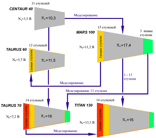 Рис. 2.6. Пример разработки компрессоров ГТД c использованием моделирования каскадов компрессора и отдельных ступеней