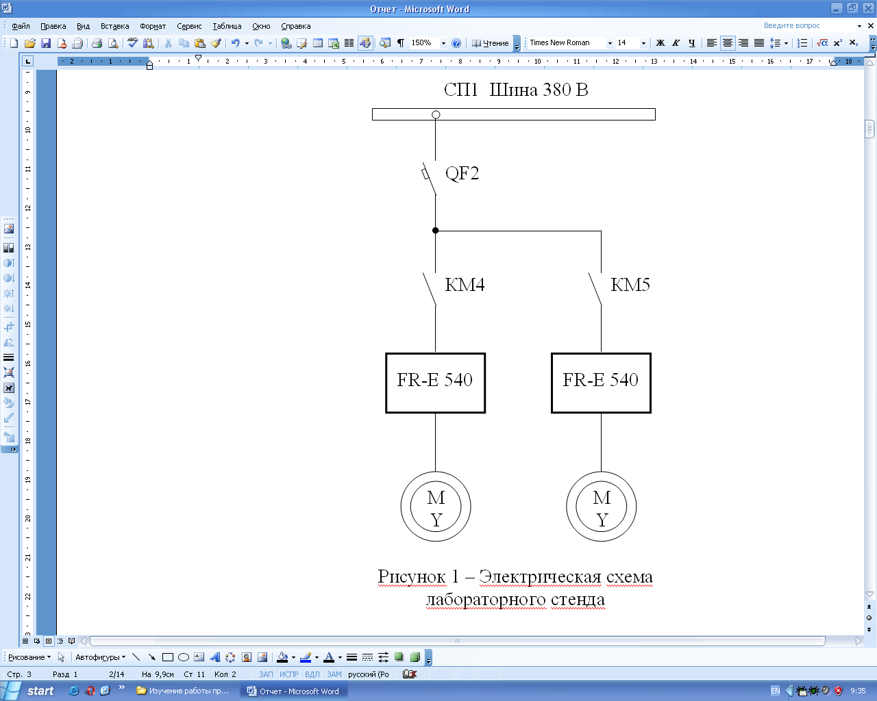 Силовая электрическая схема лабораторных стендов изображена на рисунке 1. В их состав входят комплектные электроприводы переменного тока типа FR-Е 540 (в дальнейшем просто преобразователи частоты) и асинхронные двигатели с короткозамкнутым ротором. Преобразователи частоты подключаются к сети трехфазного переменного тока напряжением 380 В с помощью автоматического выключателя QF2, который находятся в силовом распределительном пункте СП1. Включение преобразователя частоты в работу производится с помощью магнитных пускателей КМ4 и КМ5.