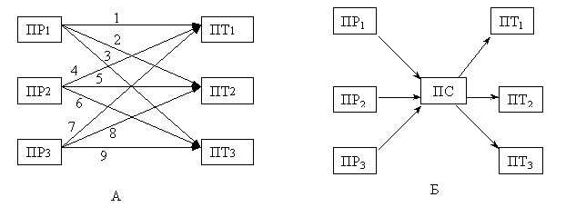 В части А показаны три производителя, которые используют прямые каналы товародвижения к трем потребителям. Такая система предполагает девять различных контактов производителей с потребителями. В части Б показано как три производителя действуют через одного посредника, который взаимодействует с тремя потребителями. Эта схема предполагает всего шесть контактов. [3. с. 327]