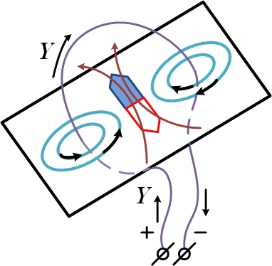 Силовые линии электрического поля замкнуты вокруг магнитного поля. Используется правило левого винта.