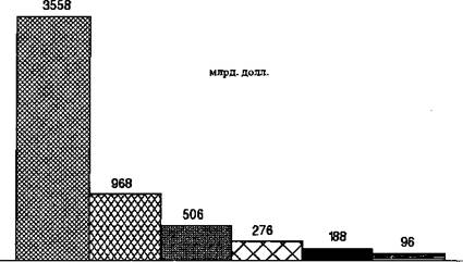 Значение отдельных форм, их удель ный вес и влияние на международную экономику различны. Международная торговля товарами, которая исторически была первой и некогда главной формой международной экономики, к кон цу XX века, судя по абсолютным масштабам, потеряла свою ведущую роль, уступив ее различным формам международных финансовых операций. Если еще в 70-е годы основное между народное перемещение капитала про исходило в форме прямых зарубежных инвестиций, то во второй половине 90-х годов на первое место вырвались меж дународные портфельные инвестиции. С большой степенью условности абсо лютные размеры отдельных форм меж дународной экономики и соотношение между ними можно представить так, как это сделано на рисунке 1.6. Следу ющие разделы учебника, после определения места международной экономики в системе экономических наук, будут посвящены изучению конкретных про явлений международной экономики, ко торые относятся к уровням ее основ, го сударственного регулирования, конкрет ных форм и международного надзора и регулирования.