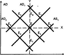 Напротив, кривую X можно интерпретировать как кривую совершенной эластичности совокупного спроса и со вокупного предложения. Если горизон тальную позицию занимает кривая совокупного предложения ( AS ), то это означает его совершенную эластичность — несмотря на неизменность цены, объемы производства неограниченно растут. Если же горизонтальную позицию занимает кривая совокупного спроса ( AD ), то это означает его совершенную эластичность — по цене не больше данной объемы потребления не ограниченны.