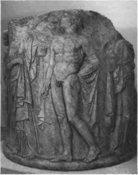 12. Алкестида, покидающая Аид. Нижняя часть колонны из храма Артемиды Эфесской, Ок. 340 г. до н. э. Мрамор. Высота 180,3 см. Британский музей Лондон