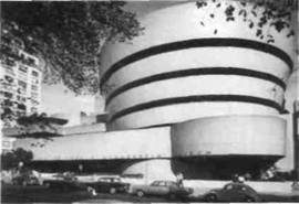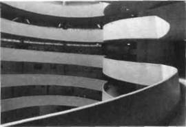 Скульптура буквально стоит у нас на дороге и настоятельно требует, чтобы мы обратили на нее внимание. Даже картины, слегка выступая над изогнутой поверхностью стен, приобретают как бы новую рельефность. Попадая в музей Гуггенхайма, зритель словно присоединяется к потоку сознания, в котором сливаются разнообразнейшие художес твенные впечатления. Правда, этот поток заключен в строгие границы, в заранее очерченные берега: такова была идея архитектора, и независимо от того, согласны мы с ней или нет, музей реально воплощает представление Райта о том, как должно происходить знакомство людей с искусством.