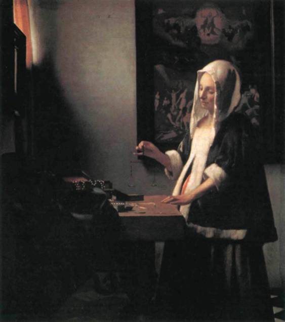 Расчет композиции отчасти строится на пер спективе. Две главные диагонали — одна образо вана верхним краем зеркала, другая правым краем стола — сходятся в той точке, где мы видим кончик мизинца женщины на фоне уголка картины в раме. Этот левый угол рамы расположен чуть выше по сравнению с правым — художник намеренно приподнял его, совместив с рукой женщины. Может быть, это имело целью привлечь внимание к картине на стене. На ней изображен Христос во славе, вершащий Страшный суд, когда людские добродетели и пороки взвешиваются на весах справедливости. Параллель между евангельским сюжетом и весами в руке у женщины, разумеется, не случайна: картину Вермеера никоим образом нельзя рассматривать как бытовую сцену. Смысл ее, однако, допускает различные толкования. До недавних пор считалось, что на чашах весов лежат драгоценности и что художник имел в виду подчеркнуть суетность благ земных перед лицом близкой смерти (когда-то картина даже называлась «Взвешивание жемчуга» или «Взвешивание золота»). Но если присмотреться внимательнее, обнаруживается, что на весах ничего нет. Это подтверждается и проведенным в последнее время исследованием полотна с помощью инфракрасных лучей; заодно выяснилось, что в процессе работы Вермеер переместил весы, расположив их ближе к плоскости картины.
