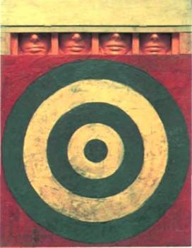 Какой же стоит за всем этим смысл? Может быть, лица наверху — это лица людей, заключен ных в тюрьму, которые смотрят на нас сквозь узкие оконца камеры. Может быть, они ждут с завязанными глазами смертной казни и скоро сами превратятся в мишени для пуль. В любом случае этот образ несет ощущение насильственного ли шения свободы и грозящей беды. Если вспомнить остроумный прием Пикассо, соединившего в «Го лове быка» велосипедное седло и руль, то здесь мы имеем нечто противоположное: Джонс составил свою композицию из подчеркнуто конфликтных элементов. Разрешить этот конфликт, примирить противоборствующие стороны мы не можем, как бы ни старались. Скрытый зловещий смысл вступает в явное противоречие с откровенно декоративной трактовкой центрального объекта — мишени. По видимому, именно это несоответствие между формой и содержанием намеренно обыгрывает художник.