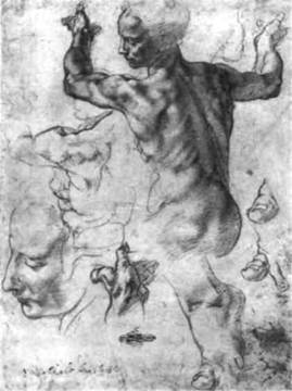 Интересно отметить, что женские фигуры Ми келанджело чаще всего писал на основе этюдов, сделанных с натурщиков-мужчин. В его представ лении только обнаженная мужская фигура вопло щала ту степень физической монументальности, которая требовалась для передачи сверхчеловече ского могущества — а именно таким могуществом должны были обладать мифологические персонажи, такие, как древняя пророчица-сивилла. В этом этюде, как и в других аналогичных листах, Ми келанджело концентрирует внимание на торсе: он подолгу изучает и тщательно выписывает муску латуру, прежде чем прорабатывать второстепенные детали, вроде пальцев ног. Поскольку поза сивиллы передана уверенно, без колебаний, можно предпо ложить, что концепция этой фигуры полностью сформировалась в сознании художника — может быть, она была уже раньше зафиксирована в подготовительном наброске. Для чего же создавался столь подробный этюд обнаженной сивиллы, если в конечном варианте она предстает одетой и к тому же составляет часть плафонной росписи, на которую обычно смотрят снизу, с большого расстояния? По видимому, Микеланджело добивался максимальной убедительности своих фигур и считал, что для этого необходима полная анатомическая достоверность. В росписи изображение сивиллы (илл. 6) впечатляет поистине сверхчеловеческой силой: она поднимает огромный, тяжелый фолиант — книгу пророчеств — с легкостью, словно пушинку.