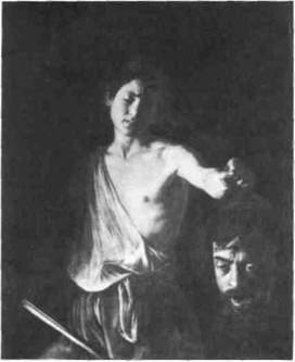 Освещение. В изобразительном искусстве (за исключением сугубо современных инсталляций) мы в основном имеем дело с отраженным светом. Что касается света неземного, божественного проис хождения, то он традиционно передавался в жи вописи несколькими способами — в виде потока золотистых лучей, в виде сияющего нимба или ореола. Если действие происходит ночью или раз ворачивается в темном помещении, художник может прямо ввести в картину источник света — например, факел или свечу. Но наиболее распрос траненный метод предполагает передачу отражен ного света с помощью градации освещенности, многообразных переходов от света к тени. Резко обозначенный контраст между светом и тенью, известный как светотень (от итал. chiaroscuro), связан с именем великого живописца итальянского барокко — Караваджо, который открыл этот прием и сделал его, если можно так выразиться, своей визитной карточкой. Характерный образец стиля Караваджо — «Давид с головой Голиафа» (илл. 9), где светотень особенно эффектно усиливает драматизм сюжета. Невидимый для зрителя ис точник света с левой стороны моделирует форму и способствует передаче фактуры, а умело расп ределенные световые блики создают удивительный эффект присутствия: возникает та самая волшебная иллюзия, когда нам кажется, что изображенный в натуральную величину Давид стоит перед нами. Живописное пространство, с его неопределенной глубиной, становится как бы продолжением реального пространства, в котором находимся мы сами. И хотя фигура Давида обрезана рамой, это впечатление сохраняется благодаря мастерски вы бранному ракурсу: левая рука Давида, которая держит страшную отрубленную голову его врага, словно тянется из темного фона навстречу зрителю. Несмотря на явную театральность приема, картина отличается тонким психологизмом — Давид смот рит на Голиафа не с торжеством, а с печалью и состраданием. Новейшие исследователи предпол агают, что для головы Голиафа Караваджо ис пользовал собственный автопортрет, и хотя это окончательно не доказано, в картине несомненно отразились трагические предчувствия художника. Вскоре после завершения «Давида» Караваджо на дуэли убил своего противника — и до конца дней принужден был скрываться от возмездия.