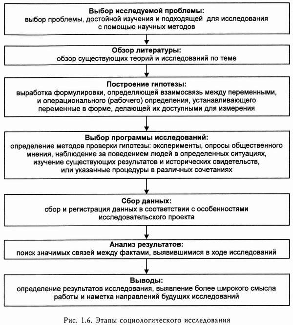 Социологическое исследование – это способ получения знаний о социальном мире, основанный на строгом сборе фактов и их логическом объяснении. Оно состоит в систематизированном ряде г шагов, направленных на обеспечение максимальной объективности в изучении проблемы. В идеальном варианте социологическое исследование следует подобной поэтапной процедуре, хотя на практике это не всегда представляется возможным. Даже при таких обстоятельствах описанные ниже этапы обеспечивают полезные вехи проведения научного исследования (рис. 1.6).